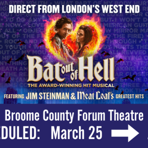 Bat Out Of Hell The Musical Venue: Broome County Forum Theatre Performance Dates & Times: Monday, April 27, ... 27 Apr 7:30 pm Broome County Forum Theatre236 Washington Street, Binghamton, NY 13901